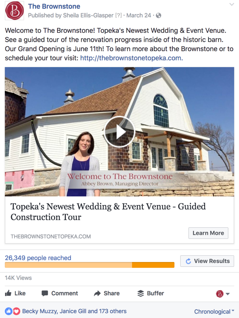 Before The Brownstone’s Grand Opening we built up their social media presence to over 1.3k fans just on Facebook. Part of The Brownstone’s social media strategy was to take the community on a journey through the renovation of the historic barn. Through photography and video we connected with people to show the extensive renovation and restoration of the barn to create The Brownstone.